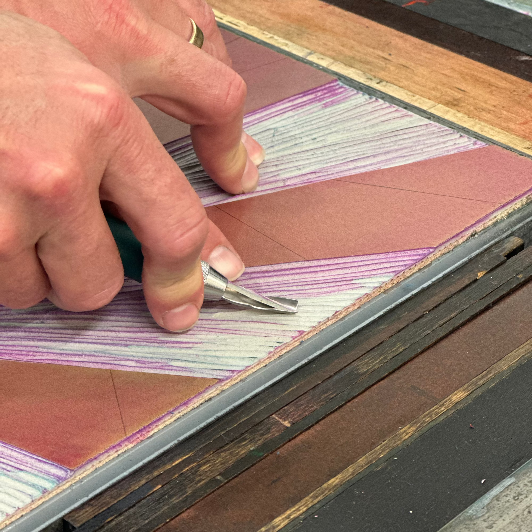 Person working with a colorful stained glass panel on a machine.
